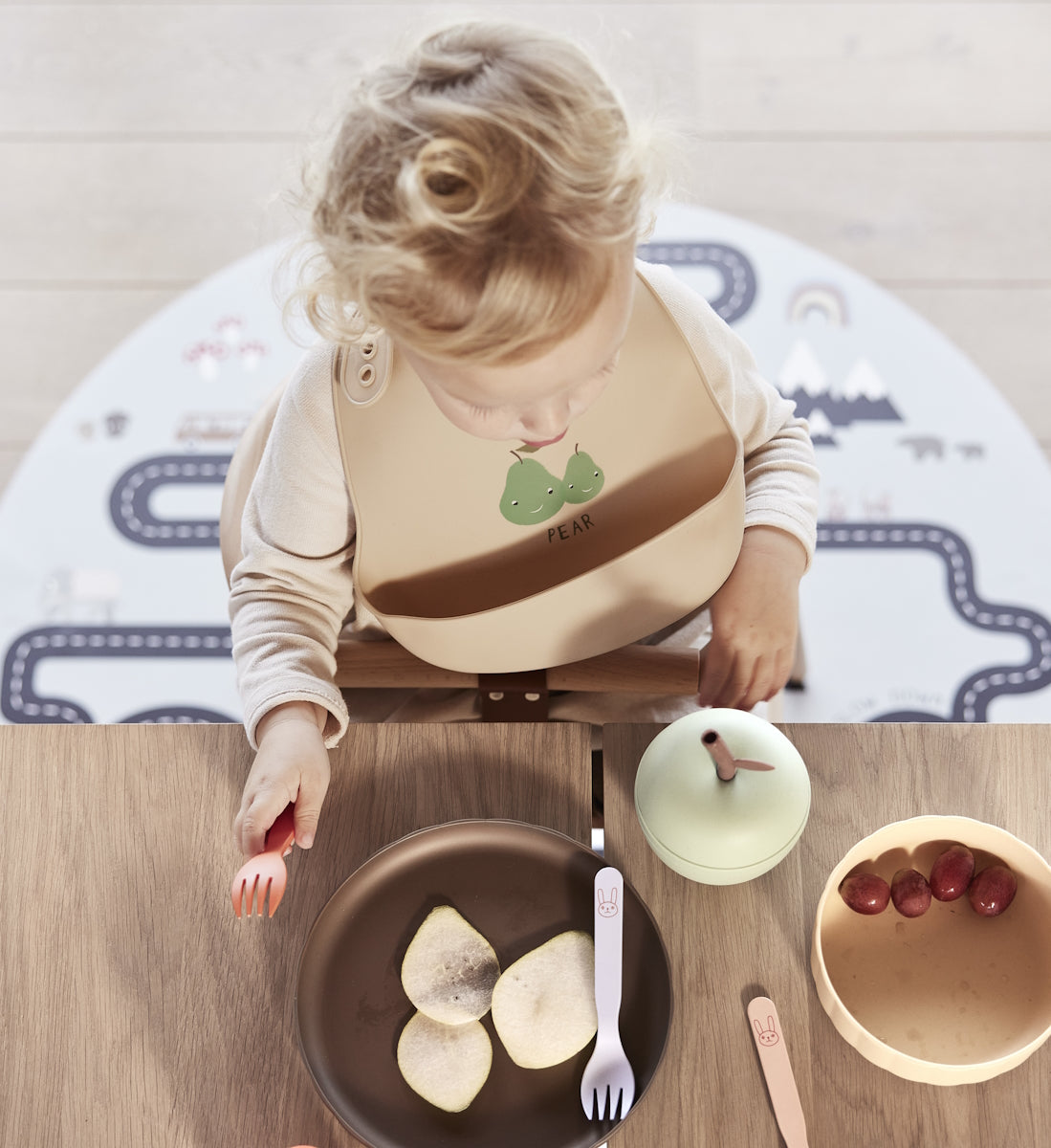 The Yummy Silicone Bib is a practical solution to mealtime messes. Featuring a convenient neck closure, this bib is designed to gather food and liquids, preventing spills and stains on clothes. Adorned with well-known Yummy characters, these bibs are crafted from 100% printed silicone, ensuring both durability, delightful designs and making cleanup a breeze with a simple wash in warm soapy water. Measures L27cm x W19cm.